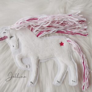 Die tollen Einhörner mit Wollmähne gibt es jetzt exklusiv bei Johlina. Beliebig kannst du die Wollmähne frisieren, verzieren, flechten und natürlich auch kürzen.