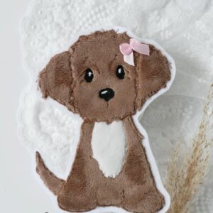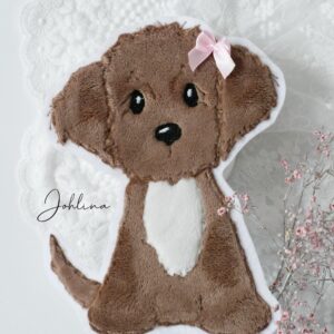 Die hochwertige Applikation wird aus weichem Plüschstoff gefertigt und hat eine süße rosa Schleife, perfekt für kleine Hundefans und liebevolle DIY-Projekte.