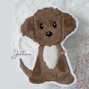 Verleihe deiner Kinderkleidung, Schultüten, Taschen, Kissen oder Babydecken eine liebevolle, individuelle Note mit diesem zauberhaften Hunde Aufnäher in mittelbraun!