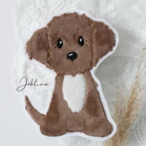 Verleihe deiner Kinderkleidung, Schultüten, Taschen, Kissen oder Babydecken eine liebevolle, individuelle Note mit diesem zauberhaften Hunde Aufnäher in mittelbraun!
