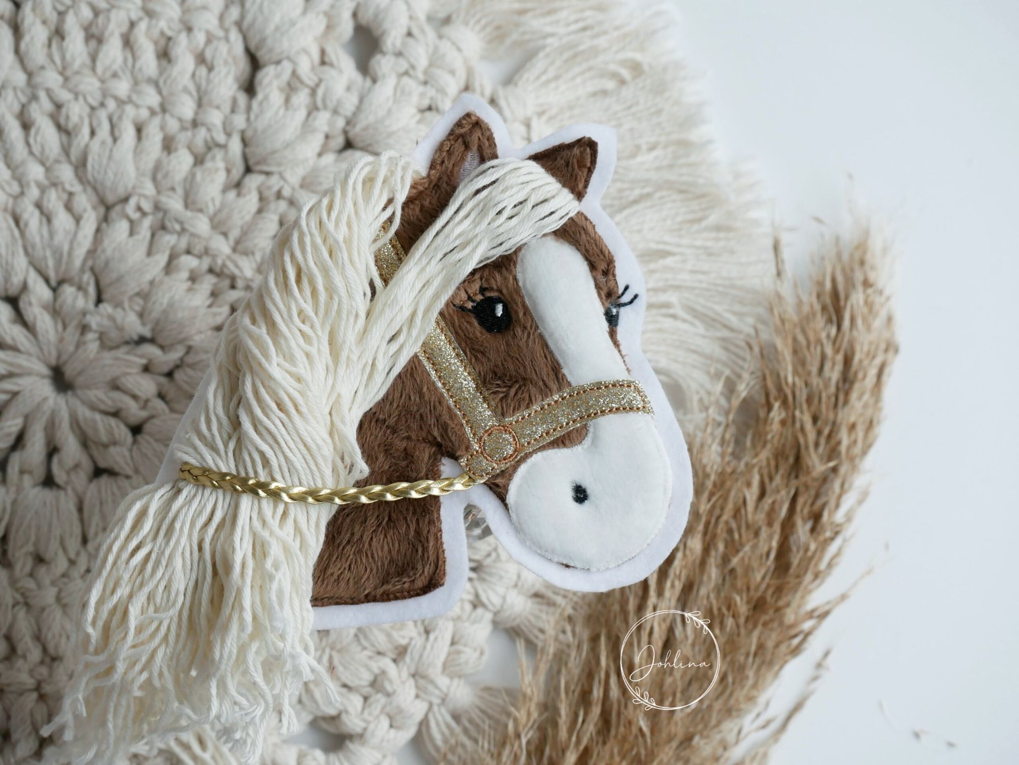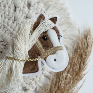 Jedes einzelne Stück wird mit viel Liebe handgefertigt – aus weichem Plüschstoff, detailverliebt bestickt und mit einer traumhaft flauschigen 3D-Mähne aus Baumwollgarn. Die glänzenden goldenen Zügel und das funkelnde Halfter verleihen dem Pferdchen einen Hauch von Magie ✨