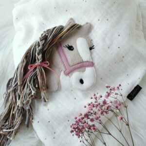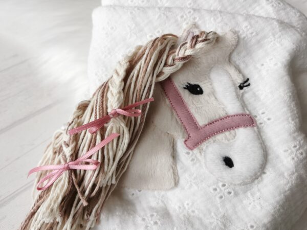 Wunderschöne Pferdestickerei mit Wollmähne und Wunschhalfter.