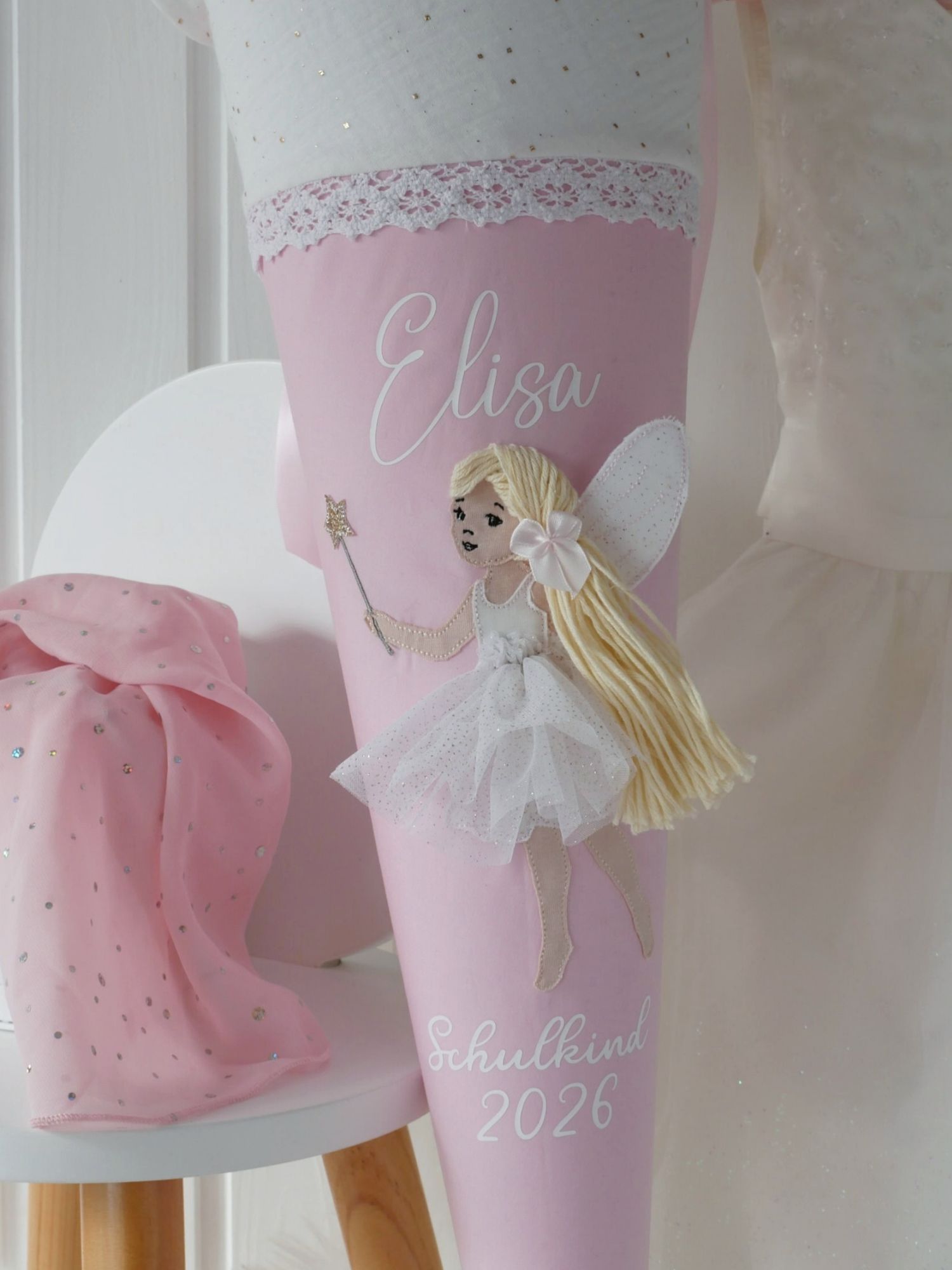 Die Stoff-Schultüte ist ca. 70 cm groß (mit Bindeteil ca. 90 cm) und bietet ausreichend Platz für alle Überraschungen zum Schulanfang. Der zarte rosafarbene Stoff harmoniert perfekt mit den glitzernden Details – ideal für kleine Tänzerinnen und Feenliebhaberinnen.