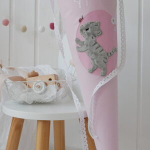 Unsere Schultüte „Mimi“ zeigt eine verspielte Katze, die gerade einen Marienkäfer beobachtet– liebevoll gestaltet für kleine Tierfreunde.